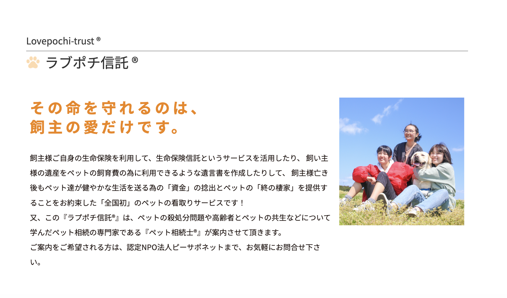 ラブポチ信託®︎は、飼い主さまに万一のことがあったときに備え、ペットの生活資金と預かり先を事前に決めておく信託制度です。